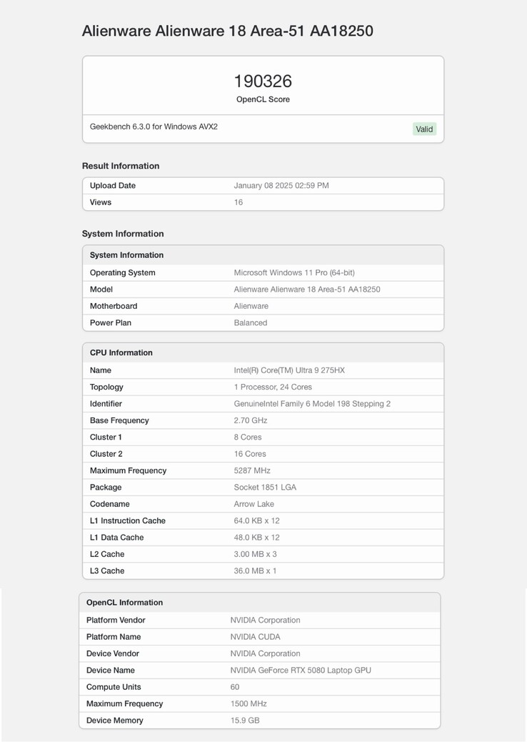 Das 18 Zoll Alienware Area-51 mit Intel Core Ultra 9 275HX und GeForce RTX 5080 Laptop-GPU wurde nun auf Geekbench getestet. Die GPU wird im Alienware Area-51 mit einer Verlustleistung von 175 Watt inklusive Dynamic Boost betrieben, es handelt sich also um die schnellstmögliche Konfiguration des Grafikchips. Bei Geekbench 6.3 OpenCL erreicht das Notebook 190.326 Punkte. Dieses Ergebnis liegt praktisch gleichauf mit dem Durchschnitt, den die GeForce RTX 4090 Laptop-GPU in unseren Tests erzielen konnte. Im Vergleich zu den 158.213 Punkten der GeForce RTX 4080 Laptop-GPU legt die RTX 5080 immerhin 20,3 Prozent in Führung.