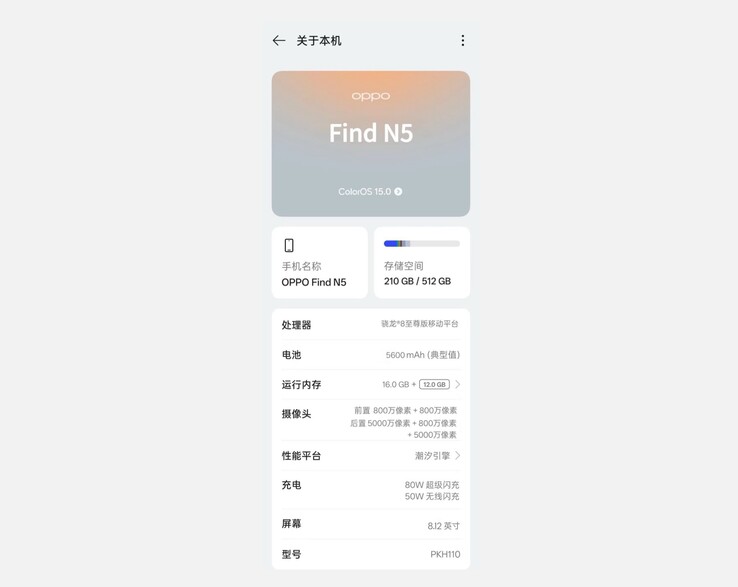 Oppo hat kürzlich bereits offiziell bestätigt, dass das Oppo Find N5 am 20. Februar enthüllt wird, und dabei bereits zahlreiche Bilder und ein Teaser-Video veröffentlicht, welche das Design des Falt-Flaggschiffs im Detail zeigen. Unterdessen ist im Netz ein Screenshot der "Über dieses Smartphone"-Seite der Systemeinstellungen des Find N5 aufgetaucht, welcher einige der wichtigsten Spezifikationen bestätigen soll.