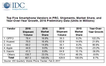 Apple lieferte im 4. Quartal 2016 mit 14,9 Mio. deutlich weniger iPhones aus, als ein Jahr zuvor (17,1 Mio.). Auf das Gesamtjahr 2016 bezogen schrumpfte das Liefervolumen für das iPhone in China sogar von vormals 58,4 Mio. auf 44,9 Millionen iPhone Smartphones. Besonders hart hat es den einstiegen Branchenüberflieger Xiaomi getroffen. In Q4/2016 halbierte sich der Marktanteil der einstigen Nummer 1 in China von 14,8 % (Q4/2015) auf 7,4 Prozent. Für das Jahr 2016 betrug der Marktanteil von Xiaomi 8,9 Prozent (2015: 15,1 %).