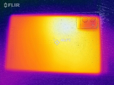 (-) Die maximale Temperatur auf der Oberseite ist 46.3 °C. Im Vergleich liegt der Klassendurchschnitt bei 33.6 °C (von 20.7 bis 53.2 °C für die Klasse Tablet).