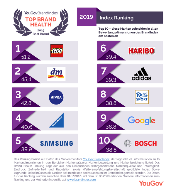 Das Brand Health-Ranking von YouGov prämiert die Marken, die in allen Bewertungspunkten des Markenmonitors "YouGov BrandIndex" am besten abschneiden. Spielzeughersteller Lego schafft es mit 51,2 Scorepunkten erneut ganz nach oben an der Spitze des Top 10-Rankings der beliebtesten Marken in Deutschland.