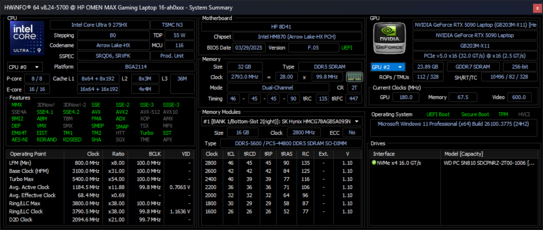 | HP Omen Max 16 ah000 Ultra 9 275HX, GeForce RTX 5090 Laptop, WDC PC SN810 2TB, OLED, 2560x1600, 16" | HP Omen 16 (2024) i9-14900HX, GeForce RTX 4080 Laptop GPU, SK hynix PC801 HFS001TEJ9X101N, IPS, 2560x1440, 16.1" | Asus ROG Zephyrus G16 GU605CX Ultra 9 285H, GeForce RTX 5090 Laptop, Western Digital PC SN5000S SDEPNSJ-2T00-1006, OLED, 2560x1600, 16" | Razer Blade 16 2025 RTX 5090 Ryzen AI 9 HX 370, GeForce RTX 5090 Laptop, SSSTC CA6-8D2048, OLED, 2560x1600, 16" | MSI Vector 16 HX A14V i9-14900HX, GeForce RTX 4080 Laptop GPU, WD PC SN560 SDDPNQE-1T00, IPS, 2560x1600, 16" | Lenovo Legion 9 16IRX9, RTX 4090 i9-14900HX, GeForce RTX 4090 Laptop GPU, Micron 3400 2TB MTFDKBA2T0TFH, MiniLED, 3200x2000, 16" | |