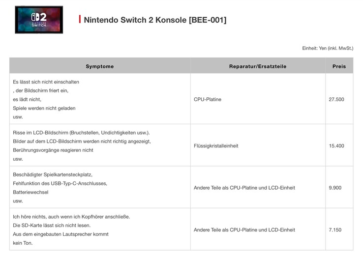 Die Nintendo Switch 2 (ca. 469 Euro auf Amazon) ist ab heute ganz offiziell verfügbar. Pünktlich zum Verkaufsstart hat Nintendo Japan eine Preisliste veröffentlicht, die zeigt, wie teuer Reparaturen der neuen Konsole sind. Nachdem Reparaturen bei Nintendo in Europa in der Regel wesentlich teurer als in Japan sind, dürften sich Kunden in Deutschland und Österreich auf noch höhere Kosten einstellen müssen.