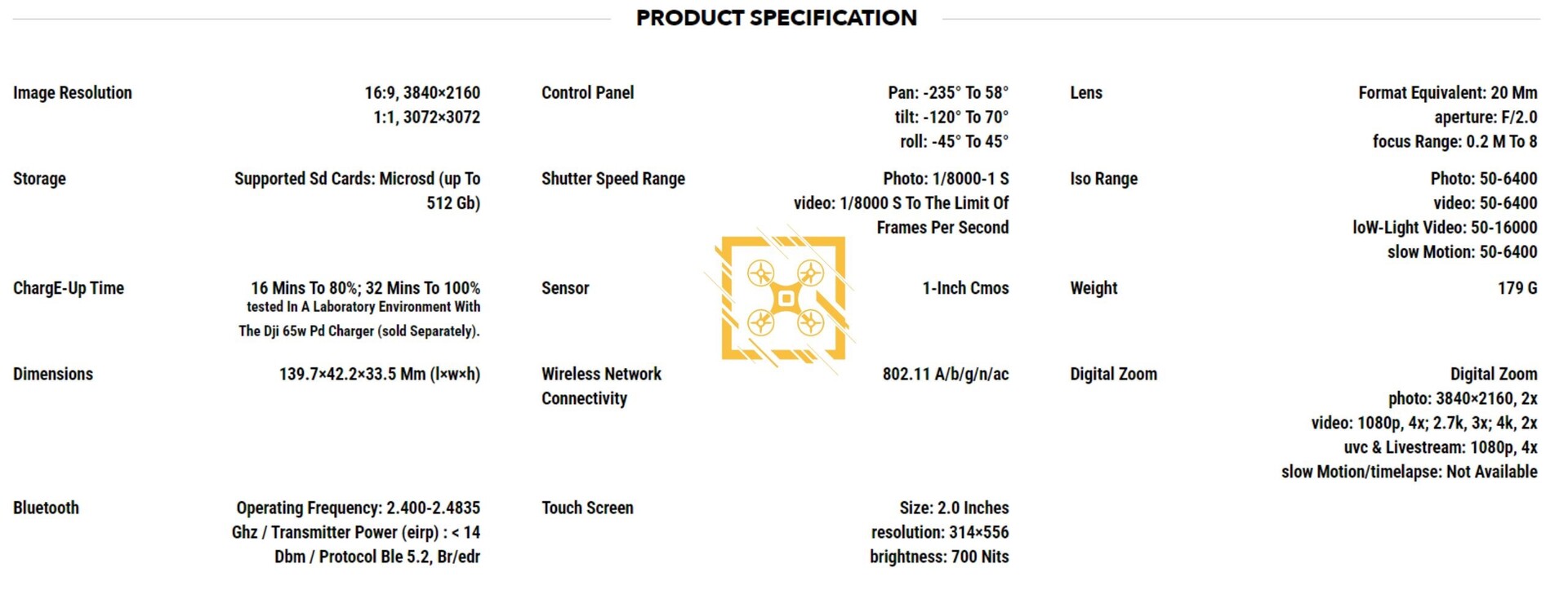 Mehr Details bietet nun das von @quadro_news geleakte Datenblatt (siehe unten). Das liefert etwa die Gehäusemaße und das Gewicht, beides steigt substantiell gegenüber der DJI Pocket 2 (hier bei Amazon erhältlich) und beträgt nun 139,7 x 42,2 x 33,5 mm sowie 179 Gramm. Der 1-Zoll-Sensor und das drehbare 2 Zoll Touchdisplay fordern also ihren Tribut. Die Kamera wird übrigens eine Blende von F/2.0 statt F/1.8 beim Vorgänger mit 1/1.7 Zoll Sensor bieten, die äquivalente Brennweite bleibt mit 20 mm gleich.