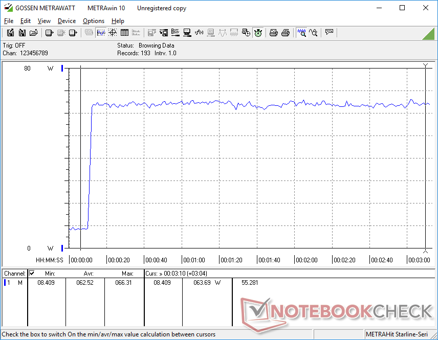 Wir messen Lastspitzen von bis zu 63 W aus dem kleinen (7,5 x 7,5 x 2,9 cm) 90-W-Netzteil, wenn Prime95 und FurMark gleichzeitig laufen. Der Adapter hat noch genug Spielraum, um den Laptop in jeder Situation gut zu versorgen und gleichzeitig den Akku zügig zu laden.