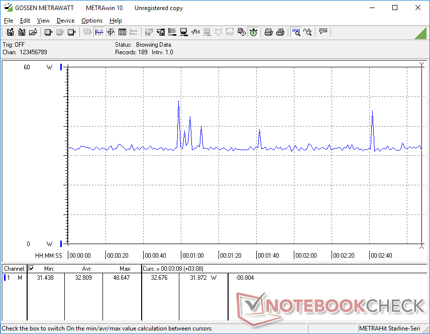 Anspruchsvollere Lasten wie 3DMark oder Witcher 3 verbrauchen um die 33 W, verglichen mit den 40 W oder mehr eines VivoBook S15 D533UA oder Lenovo ThinkBook 15 G3. Das liegt aber auch an der schwächeren Grafikleistung unseres Single-Channel-RAM-Modells, wie bereits erwähnt. Ein Upgrade auf Dual-Channel-RAM steigert sowohl die Leistung als auch den Verbrauch.