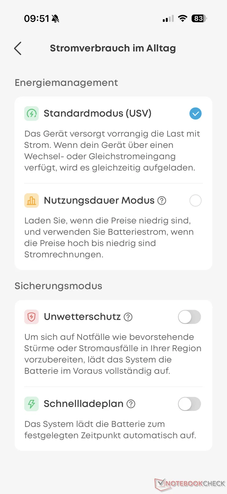 Während wir es bei der F3000 vermisst haben, gibt es bei der C2000 Gen 2 wie bei der C1000 Gen 2 verschiedene Modi. So lässt sich einstellen, dass die Powerstation automatisch zu Zeiten laden soll, zu denen die Energiekosten im Zusammenspiel mit einem dynamischen Stromtarif besonders günstig sind. Eine direkte Anbindung gibt es aber weiterhin nicht.