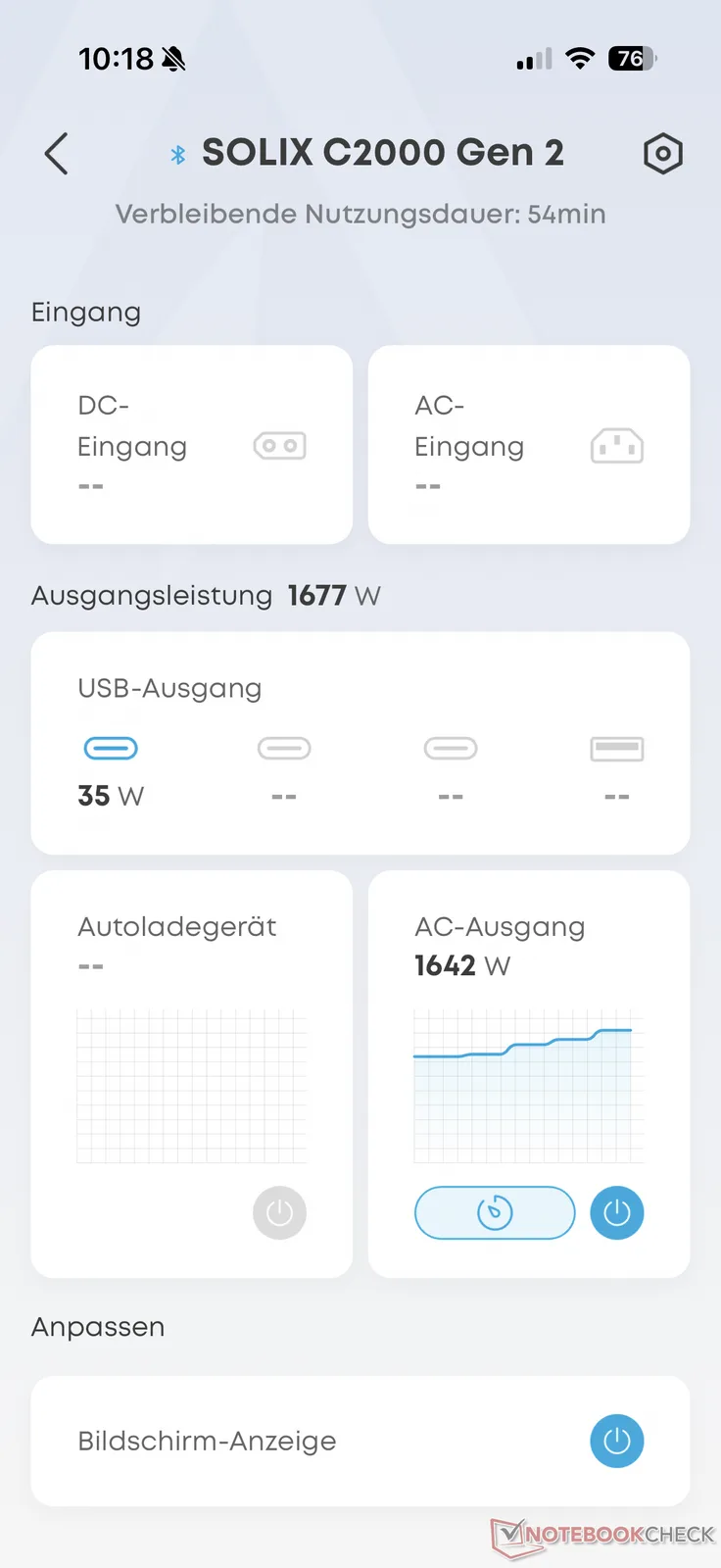 Wie bei den anderen Powerstations des Herstellers lässt sich auch das neue 2-kWh-Modell via Bluetooth sowie optional WLAN aus der Ferne per Smartphone oder Tablet steuern. Die App informiert nicht nur über den Ladezustand, die Akkutemperatur sowie die Energieströme. Sondern sie ermöglicht auch die Fernsteuerung der einzelnen Ports.