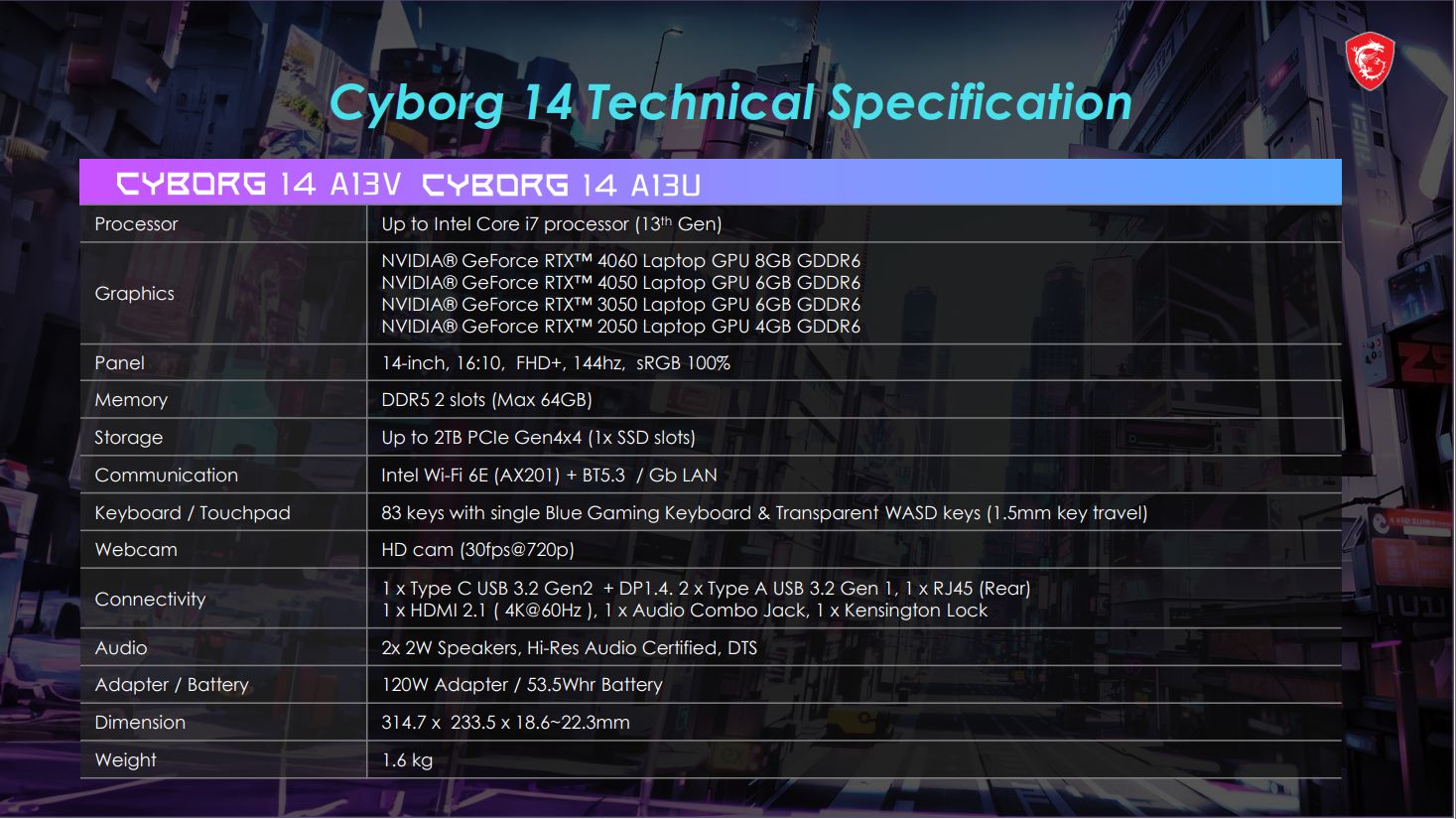 Weiterhin erhält man ein 14 Zoll großes 16:10-Display mit einer Auflösung von 1.920 x 1.200 Bildpunkten, 100 % sRGB und einer Bildwiederholrate von 144 Hz. Die Tastatur besitzt einen Hub von 1,5 mm und eine hellblaue Hintergrundbeleuchtung. Die WSAD-Tasten und der Einschaltknopf sind zudem semi-transparent. Das Cyborg 14 selbst besitzt ein transluzides Gehäuse, wiegt 1,6 kg und ist zwischen 18,6 mm und 22,3 mm dick.