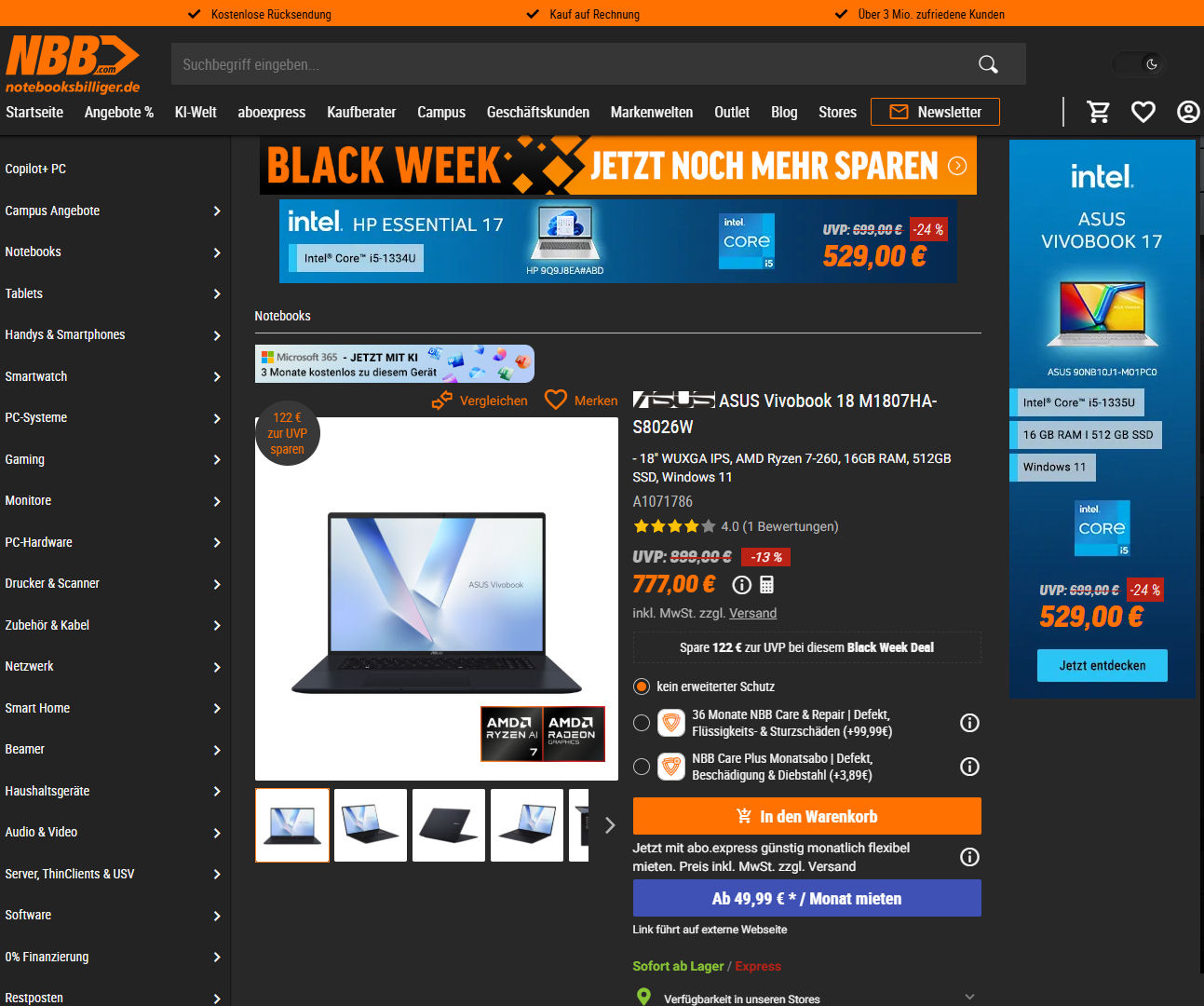 Notebooks mit Bildschirmgrößen jenseits von 17 bzw. 17,3 Zoll stellen eine Rarität dar. Während im Gaming-Bereich einige (hochpreisige) Modelle verfügbar sind, sah es im Office-Bereich bis vor kurzem düster aus. Das änderte sich 2025 mit der VivoBook-18-Reihe der Firma Asus. Die Serie umfasst Notebooks im 18,4-Zoll-Format, die in den Bereichen Office und Multimedia verortet sind. Notebooksbilliger.de führt aktuell ein Modell der Reihe zu einem Angebotspreis von 777 Euro im Sortiment. Das VivoBook haben wir bereits getestet: Es erreichte die Bewertung „Gut (77%)“.