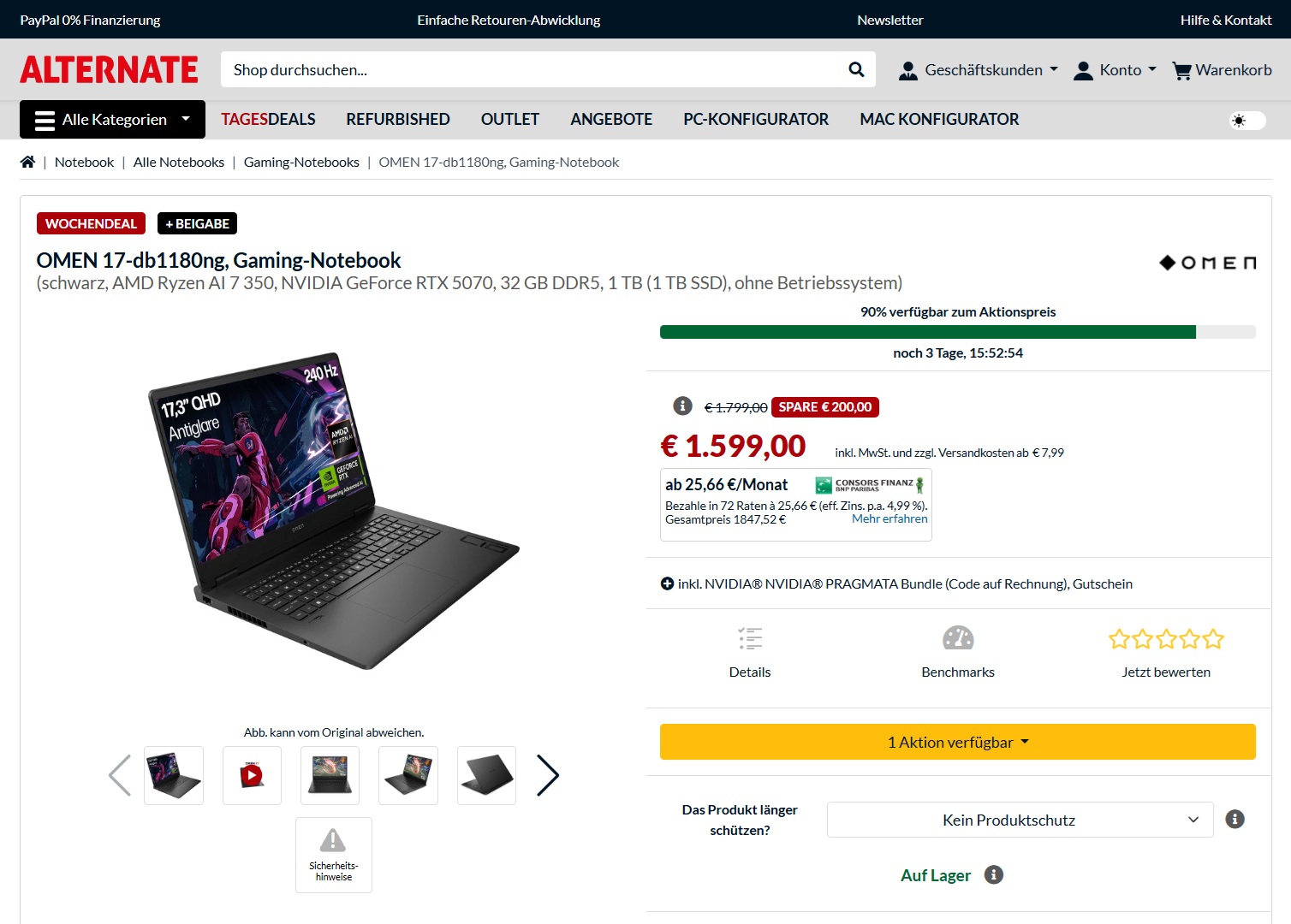 Die Omen-Reihe der Firma Hewlett Packard steht für Gaming-Notebooks der Mittel- und Oberklasse. Aktuell führt Alternate.de mit dem Omen 17-db1180ng ein AMD-basiertes 17.3-Zoll-Modell der Reihe zu einem Preis von 1.599 Euro im Sortiment. Ein Schwestermodell ergatterte die Note „Gut (82 %)“ in unserem Test.