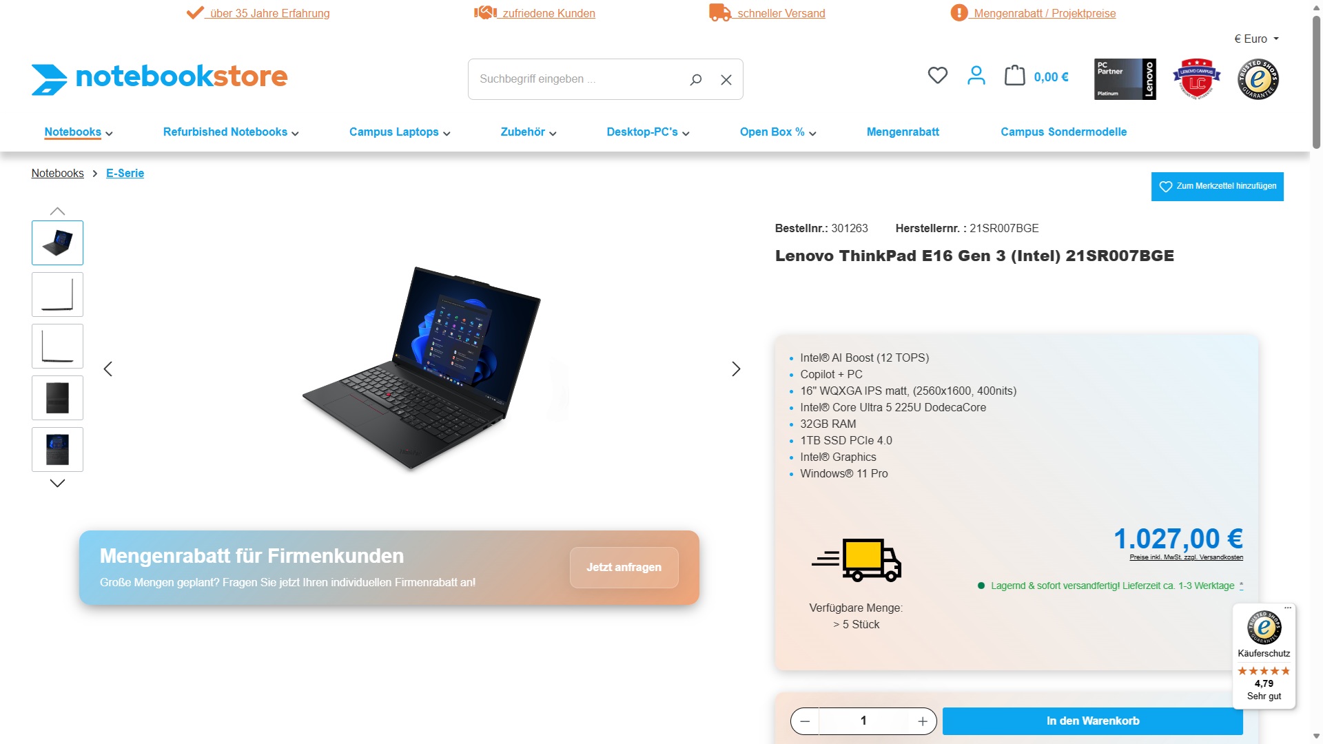 Den Einstieg in die Welt der ThinkPads bildet die im mittleren Preissegment angeordnete ThinkPad-E-Reihe. Aktuell führt Notebookstore.de mit dem ThinkPad E16 G3 21SR007BGE ein gut ausgestattetes, Intel-basiertes 16-Zoll-Modell zu einem Preis von 1.027 Euro im Sortiment. Minaxum.it liegt mit einem Preis von 1.034,30 Euro knapp dahinter. Ein Schwestermodell erreichte in unserem Test die Wertung "Gut (87 %)".