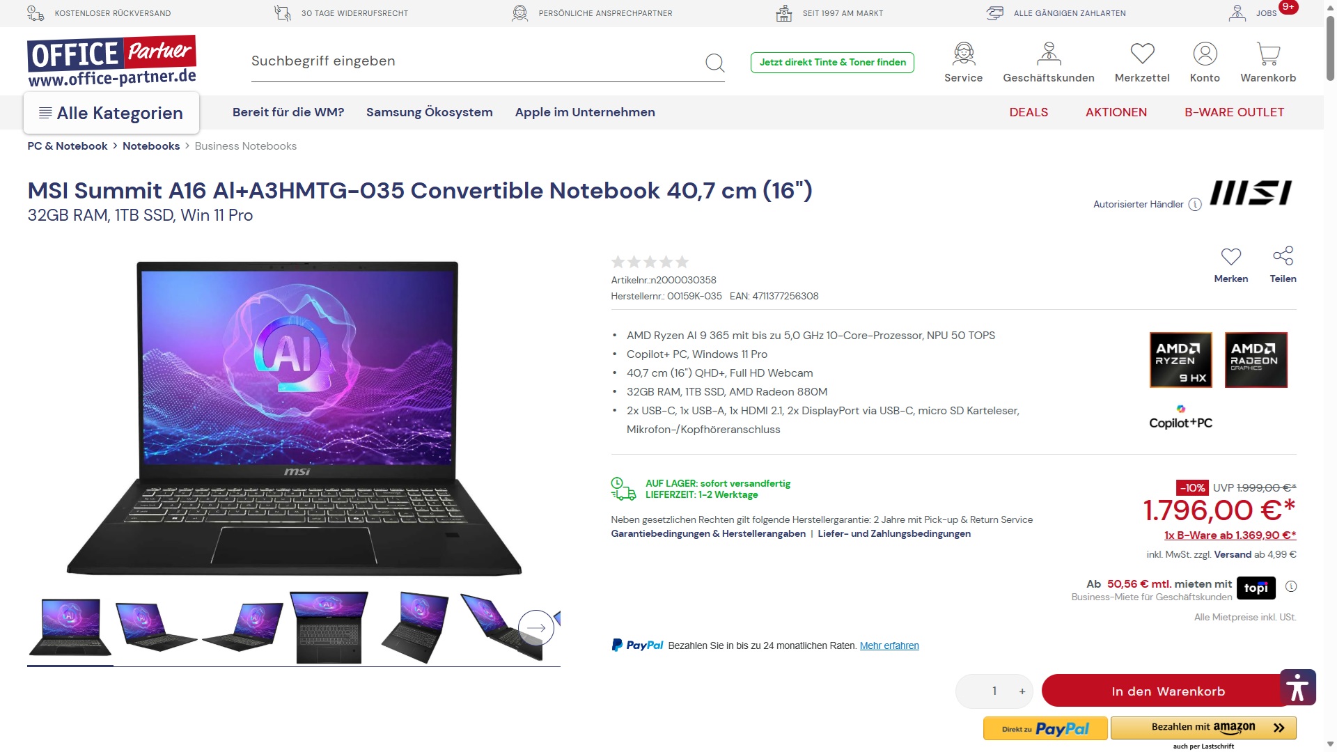 MSI hält mit dem Summit A16 AI+ A3HMTG-035 ein leistungsstarkes, gut ausgestattetes 16-Zoll-Convertible parat, das sich zu den sogenannten Copilot+ PCs zählen darf. Aktuell führen Office-Partner.de und Playox.de das 2-in-1-Gerät zu Preisen von 1.796 Euro bzw. 1795,99 Euro im Sortiment. Der Rechner erreichte die Note „Gut (82 %)“ in unserem Test.