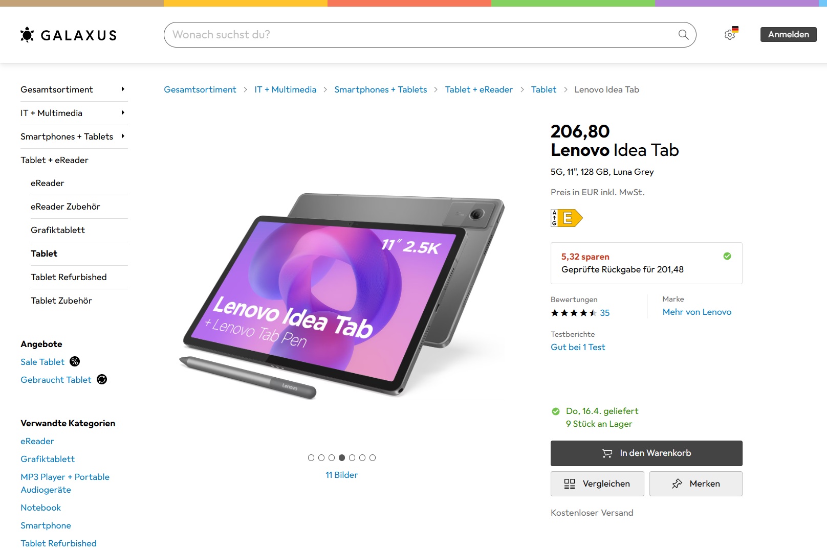 Lenovos Idea-Tab-Reihe steht für gut ausgestattete Android-Tablets, die kein allzu tiefes Loch in den Geldbeutel reißen. Aktuell führt Galaxus.de mit dem Idea Tab TB336ZU ZAFM0112SE einen Vertreter der Reihe zu einem Preis von 206,80 Euro im Sortiment. Ein Modell ohne 5G wäre zu einem Preis von 174 Euro bei Coolblue.de, Galaxus.de, MediaMarkt.de und Saturn.de zu finden. Ein Schwestermodell erreichte die Wertung "Gut (78 %)" in unserem Test.