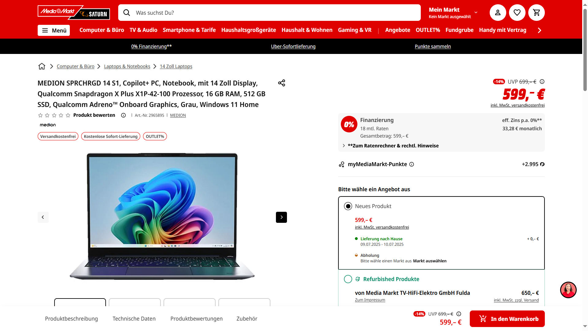 Update 09.07.25: MediaMarkt und Saturn verkaufen das Notebook auch via eBay.de (MediaMarkt, Saturn). Dank einer aktuell laufenden Rabattcode-Aktion kann das Notebook dort bereits zu einem Preis von 549 Euro erworben werden.