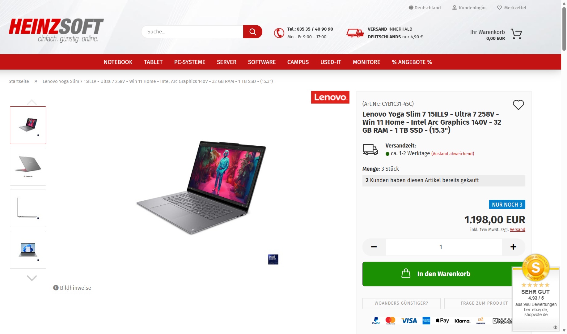 Lenovo hält mit der Yoga-Slim-7-Reihe eine Serie schicker, kompakter, leistungsstarker Notebooks der Oberklasse bereit. Aktuell führen Heinzsoft-Shop.de und PCKing.de mit dem Yoga Slim 7 15IIL9 83HM006AGE ein gut ausgestattetes 15.3-Zoll-Modell der Reihe zu Preisen knapp unterhalb von 1.200 Euro in ihren Sortimenten. Ein Schwestermodell konnte in unserem Test die Note „Gut (84 %)“ erreichen.