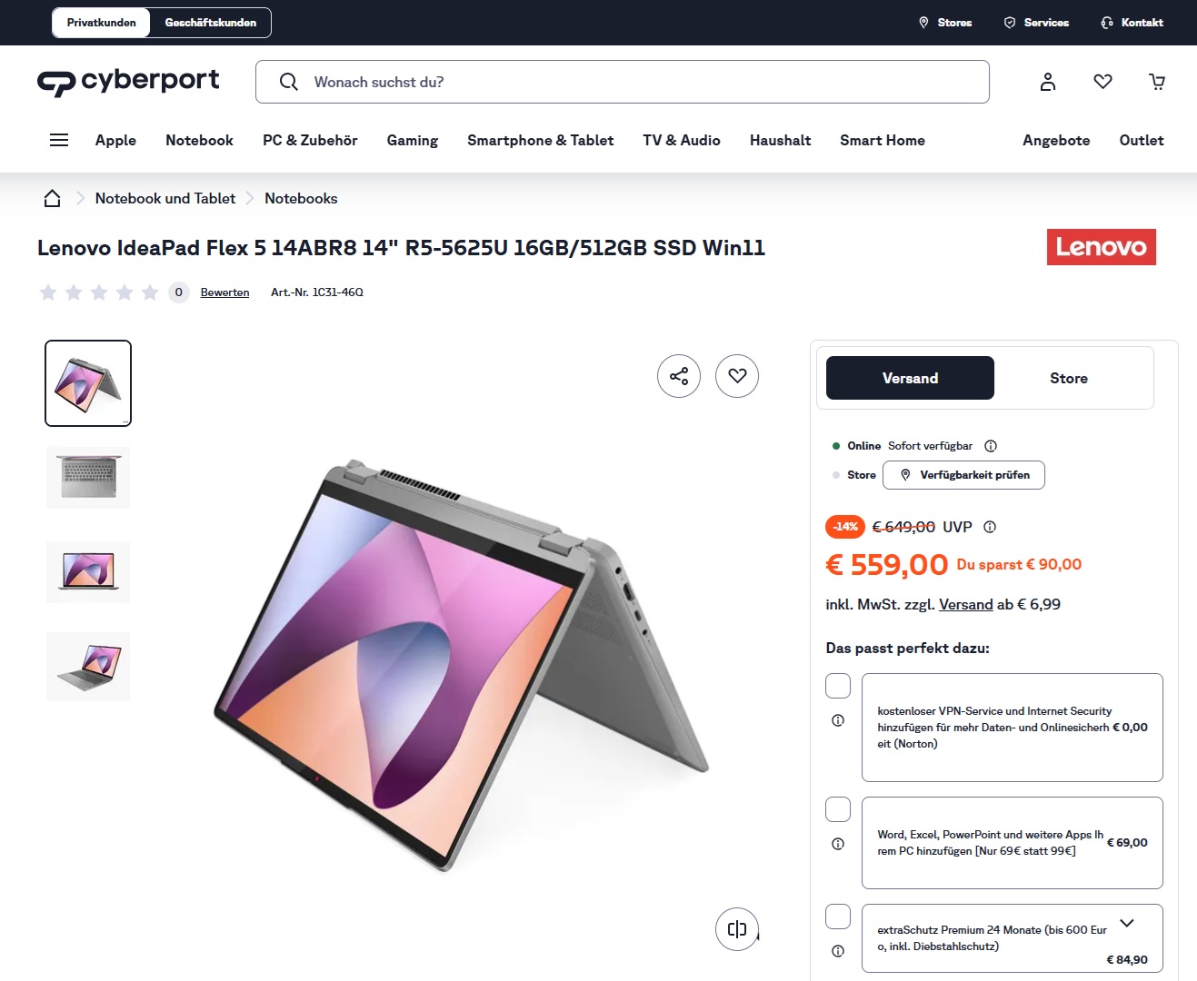 Lenovo hält mit der IdeadPad-Flex-5-Reihe eine Serie von Convertibles - Notebooks mit um 360 Grad umklappbaren Displays - bereit. Cyberport.de führt mit dem IdeaPad Flex 5 14ABR8 82XX00JPGE (Farbe: Grau) ein AMD-basiertes Modell der Serie zu einem Preis von 559 Euro im Angebot. Ein Intel-basiertes Schwestermodell musste sich bereits unserem Test stellen und erreichte dabei die Bewertung „Gut (82 %)“.