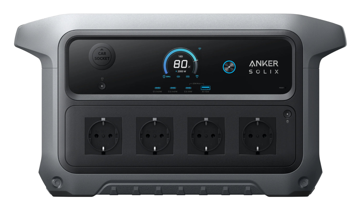 Die neue Anker Solix C2000 Gen 2 positioniert sich zwischen den Modellen C1000 Gen 2 (ca. 700 Euro bei Amazon) und F3000 (ca. 2.000 Euro bei Amazon). Sie wartet mit einer Kapazität von 2.048 Wh auf. Mit einer Nennleistung von 2.400 W und einer Spitzenlast von 4.000 W kann der Solargenerator allerhand Geräte versorgen, beispielsweise beim Camping oder bei einem Stromausfall. Hierfür stehen neben vier AC-Steckdosen auch mehrere USB-A- und USB-C-Anschlüsse mit bis zu 140 W sowie eine 12-V-Autosteckdose zur Verfügung.