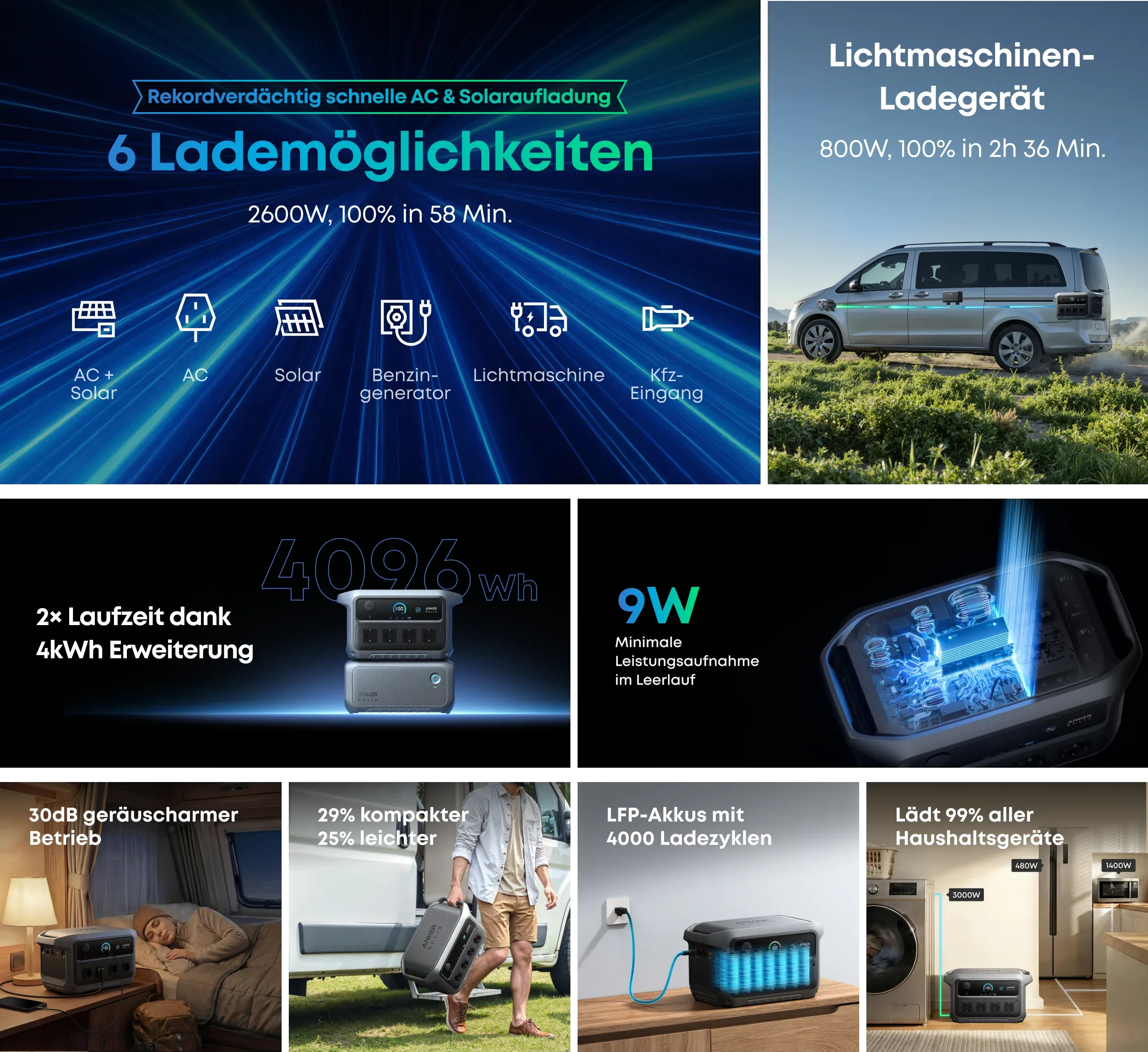 Im Vergleich zum Vorgänger F2000 ist die neue C2000 Gen 2 nicht nur um mehr als 10 kg leichter und deutlich kompakter, wiegt nun 18,9 kg. Sondern sie lädt auch besonders schnell. Bei Kombination von AC und DC (Solar) sind bis zu 2.600 W möglich, sodass die Powerstation in unter einer Stunde vollständig geladen ist. Über ein Lichtmaschinen-Ladegerät lässt sie sich zudem auch während der Fahrt laden.