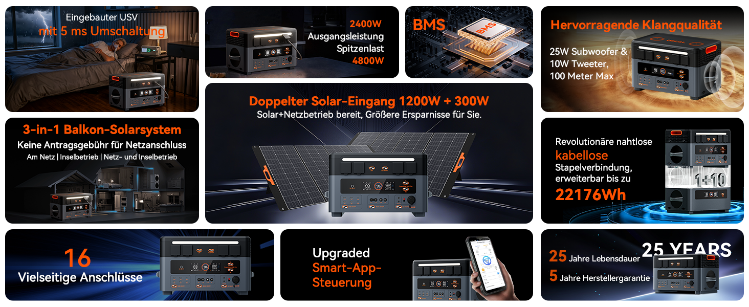 Oscal zählt zwar nicht zu den bekanntesten Herstellern von Powerstations, hat sich aber bereits durch diverse Produkte für den Outdoorbereich einen Namen gemacht. In der PowerMax 2400 Pro setzt das Unternehmen auf langlebige LFP-Batteriezellen mit einer Kapazität von 2.016 Wh, wobei diese über Zusatzbatterien auf bis zu 22 kWh ausbaubar ist. Über vier Steckdosen stellt sie bis zu 2.400 W Dauerleistung (4.800 W Spitzenleistung) bereit.