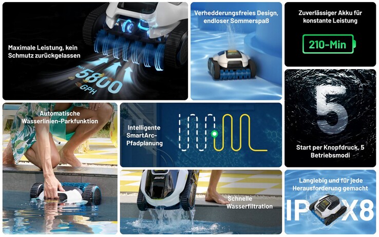 Der Roboter bahnt sich mit SmartArc-Pfadplanung intelligent seinen Weg und soll so eine vollständige Poolabdeckung garantieren. Er reinigt Boden, Wände und Wasserlinie und stellt hierfür fünf verschiedene Modi zur Verfügung. Das dreifache bürstenlose Motorsystem weist laut Herstellerangaben eine Saugleistung von 5.800 GPH auf und filtert den aufgesammelten Dreck in einem 180 μm Filterkorb.