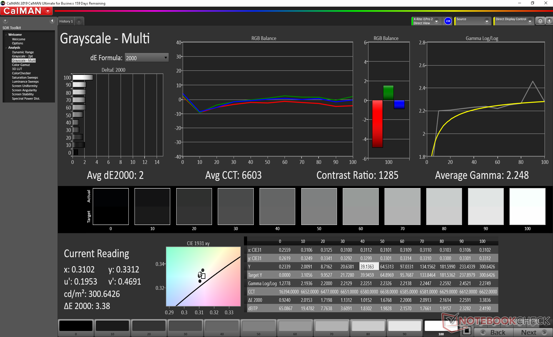 | Delta E Graustufen * | 6.8 | 3.08 55% | 1.93 72% | 1.2 82% | 1.34 80% | 5.5 19% |