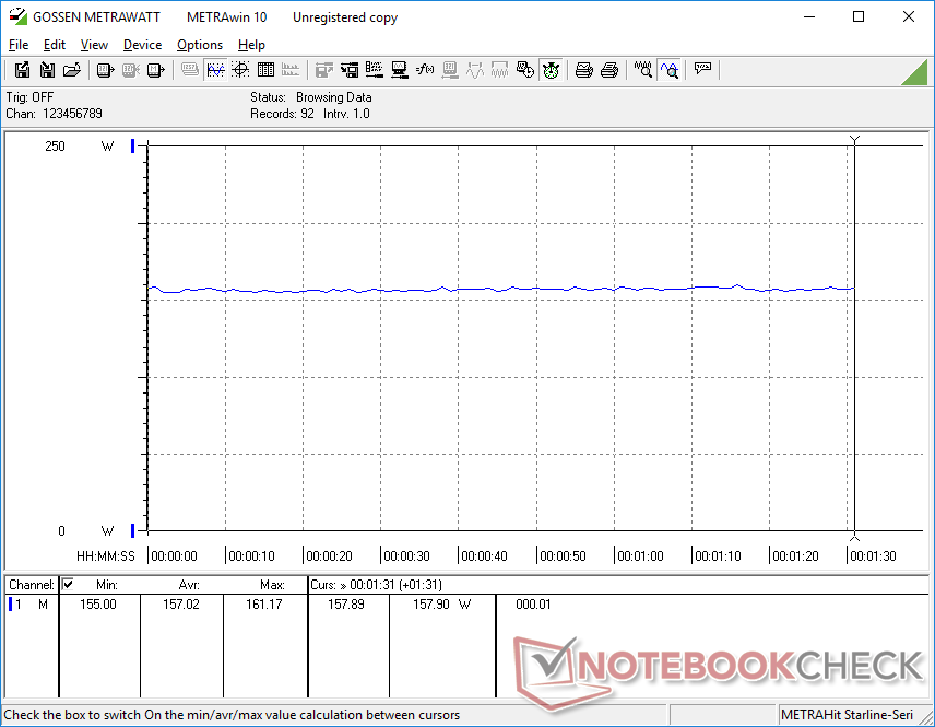 Die Energieaufnahme unter Witcher 3 ist geringer als jene, die wir im letztjährigen Blade Pro 17 mit dem anspruchsvolleren 4K-UHD-Display gemessen haben. Abgesehen davon entspricht es den Werten anderer mit einer GeForce RTX ausgestatteter 17,3-Zoll-Gaming-Laptops. Wir haben eine maximale Energieaufnahme von 219,9 W gemessen. Das relativ kompakte Netzgerät (17 x 7 x 2,5 cm) hat eine Nennleistung von 230 W.