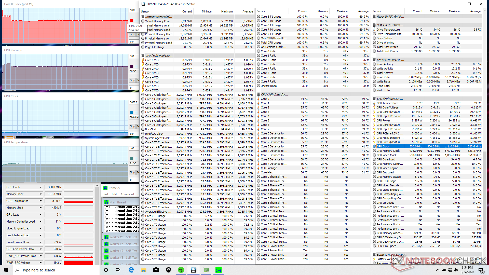 Läuft Prime95, steigt die Taktrate etwa 20 Sekunden lang auf 3,8 bis 4 GHz, bis eine Kerntemperatur von 75 °C erreicht wird. Danach fällt die Taktrate auf 3,2 GHz zurück, um eine kühlere Kerntemperatur von 66 °C aufrecht zu halten.