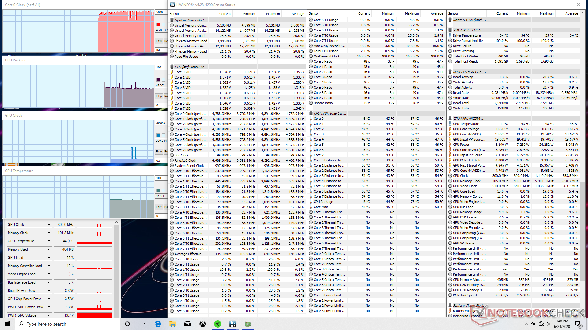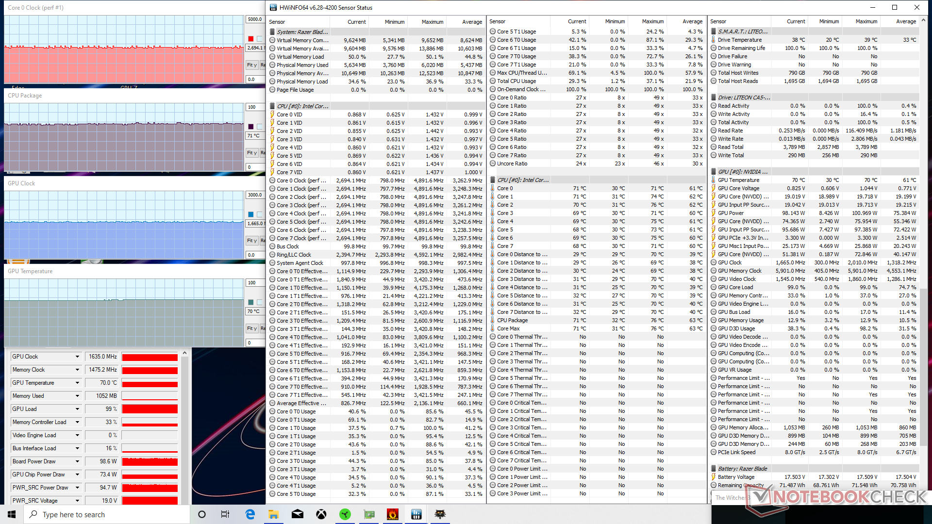 Sowohl die CPU- als auch die GPU-Temperaturen stabilisieren sich während dem Witcher-3-Test bei nur 70 °C, was etwa den Werten des 2019er Blade Pro 17 mit RTX 2080 Max-Q entspricht.