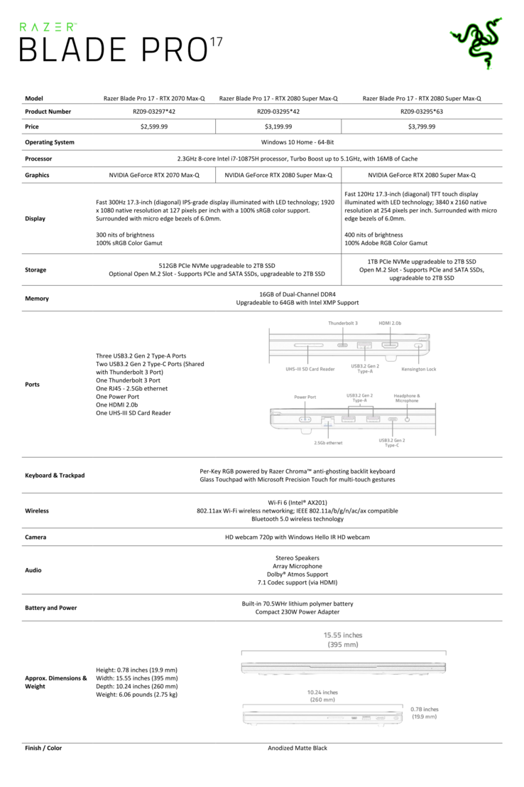 | Razer Blade Pro 17 RTX 2070 Max-Q 300 Hz i7-10875H, GeForce RTX 2070 Max-Q, Lite-On CA5-8D512, IPS, 1920x1080, 17.3" | Asus ROG Zephyrus S GX701GXR i7-9750H, GeForce RTX 2080 Max-Q, Samsung SSD PM981 MZVLB1T0HALR, IPS, 1920x1080, 17.3" | MSI GS75 Stealth 9SG i7-9750H, GeForce RTX 2080 Max-Q, 2x Samsung SSD PM981 MZVLB1T0HALR (RAID 0), IPS, 1920x1080, 17.3" | Alienware m17 R2 P41E i9-9980HK, GeForce RTX 2080 Max-Q, 2x SK Hynix PC601 NVMe 512 GB (RAID 0), IPS, 1920x1080, 17.3" | Aorus 17G XB i7-10875H, GeForce RTX 2070 Super Max-Q, Samsung SSD PM981a MZVLB512HBJQ, IPS, 1920x1080, 17.3" | Razer Blade Pro 17 4K UHD 120 Hz i7-9750H, GeForce RTX 2080 Max-Q, Samsung SSD PM981 MZVLB1T0HALR, IPS, 3840x2160, 17.3" | |