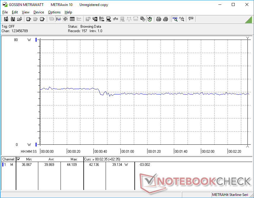 Wir haben eine kurzfristige maximale Energieaufnahme von 46 W gemessen. Das integrierte Netzgerät ist recht klein (10 x 4 x 2,7 cm) und hat eine Nennleistung von 45 W.