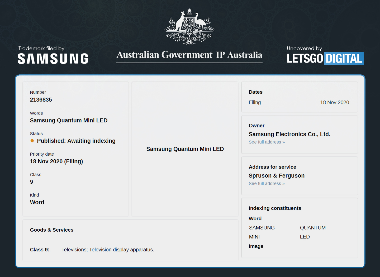 Bereits im Oktober berichteten wir auf Basis einer Trendforce-Analyse über die Wahrscheinlichkeit von Mini-LED QLED-Displays in Samsungs TV-Geräten des Jahres 2021, nun bestätigt sich die These der Marktbeobachter auch durch ein Trademark, das sich Samsung in Australien schützen ließ. Es lautet auf die Bezeichnung "Samsung Quantum Mini-LED", wie man im Screenshot unten sehen kann und bezieht sich explizit auf die Kategorie TV-Geräte.