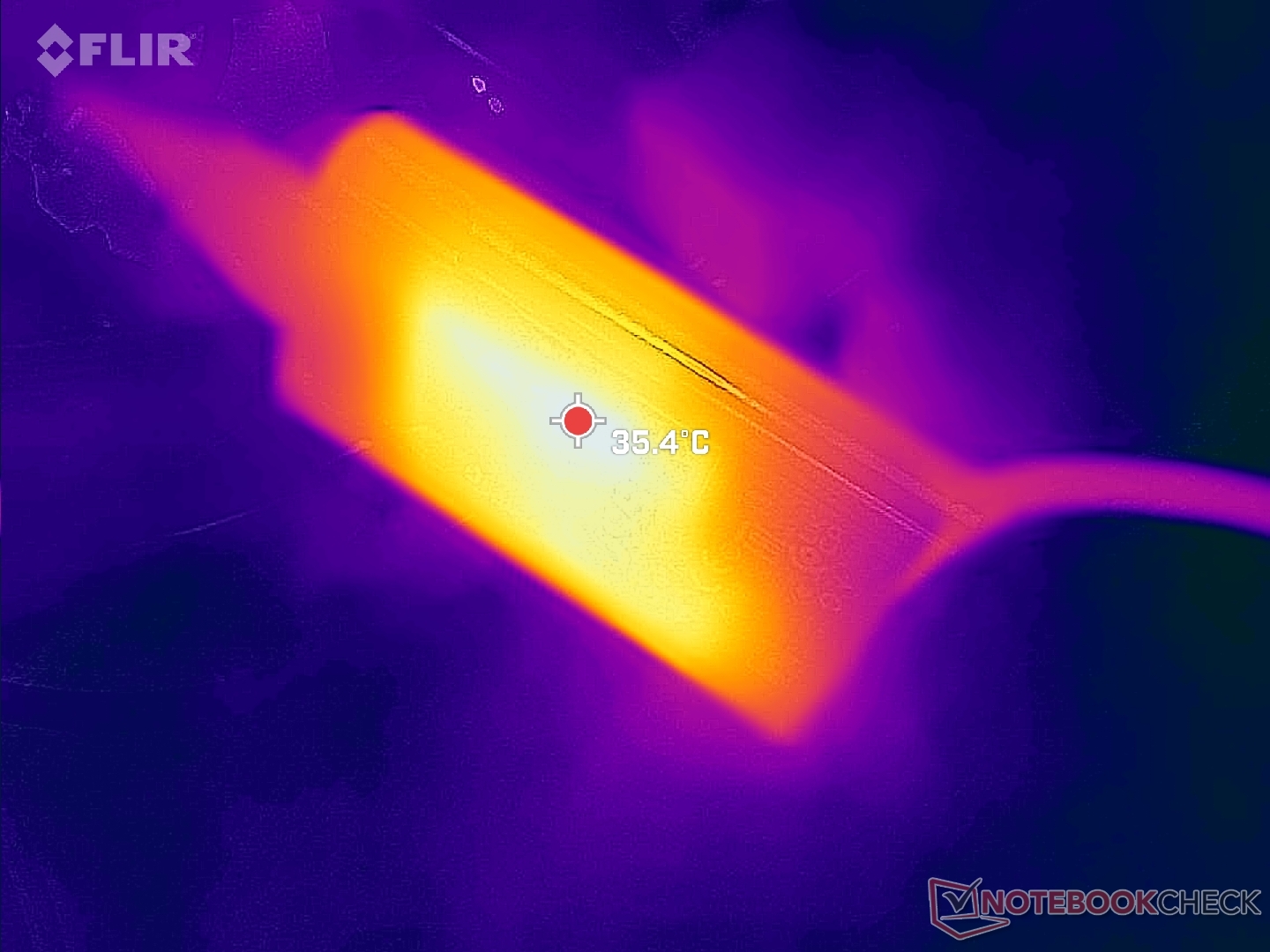 Wir konnten mit dem kleinen (~9,6 x 5,4 x 2,2 cm) 65-Watt-Netzteil eine maximale Leistungsaufnahme von 48 W messen. Dieser Wert ist aufgrund des begrenzten Turbo-Boost-Potenzials des Systems nur temporär, wie die Screenshots unten zeigen.
