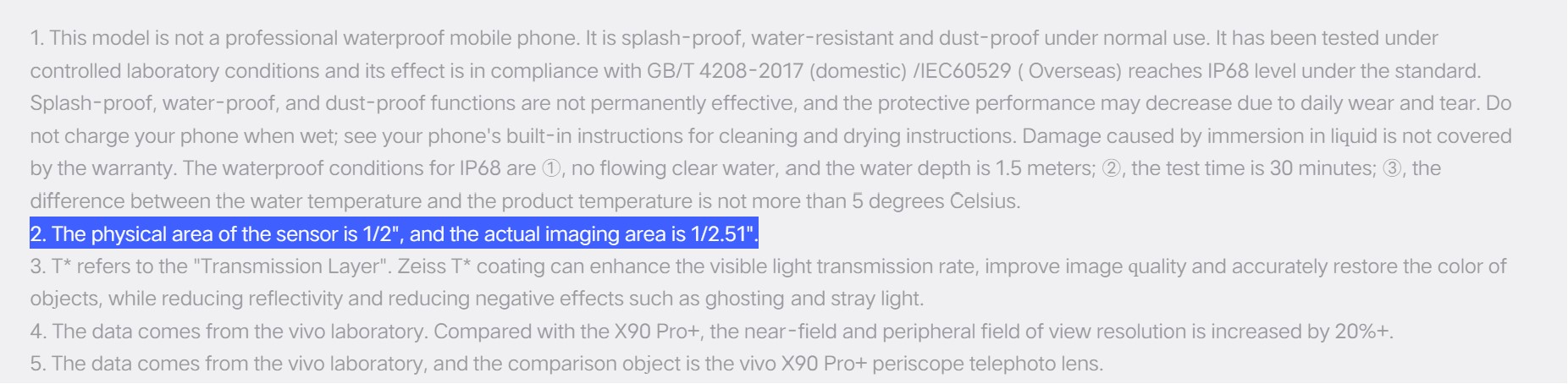 Und wenn wir schon beim Kleingedruckten sind - ganz so beeindruckend ist der Größenunterschied zwischen der Telefoto-Kamera des Xiaomi 14 Pro und der des Vivo X100 Pro nicht. Ersteres nutzt ja den ISOCELL JN1 von Samsung, der mit 1/2.76 Zoll im Datenblatt steht. Vivo wirbt auf seiner Webseite dagegen mit einem 1/2 Zoll großen Super-Tele, versteckt allerdings den Hinweis in einer Fußnote, das davon nur 1/2.51 Zoll tatsächlich genutzt werden (siehe auch Screenshot unten). Das soll die optische Leistung, die Vivo mit der neuen Zoomkamera offenbar tatsächlich abliefern kann nicht schmälern, erwähnenswert ist es aber dennoch. Das beste Zeiss-Telefoto wird man von Vivo vermutlich ohnehin erst mit dem Vivo X100 Pro+ beziehungsweise Vivo X100 Ultra bekommen, das neuesten Informationen zufolge 2024 noch nachgeliefert wird.