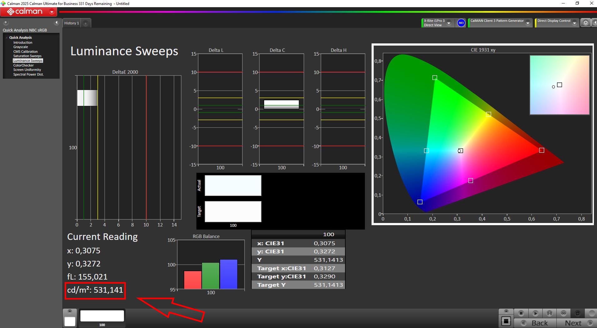 Stellen wir die Helligkeit auf 100 Prozent hoch, dann messen wir rund 530 Nits (beachten Vergleich in der unteren Tabelle). PWM wird nicht eingesetzt, die Reaktionszeiten sind schon im Standard flott, zusätzlich gibt es einen Overdrive-Modus.