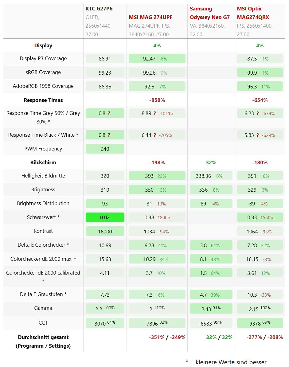 Creators dürften es indes schwer haben sich mit dem Gaming-OLED von KTC anzufreunden, da einerseits der dargestellte Farbraum lediglich sRGB voll umfasst, DCI-P3 und AdobeRGB jedoch nur zu rund 87 Prozent und andererseits die Farbabweichungen nicht unerheblich sind. Dies gilt vor allem für die schwache Werkskalibrierung, die im Standardmodus hohe Abweichungen mit sich bringt. Unsere eigene Kalibrierung mittels X-Rite-Farbmessgerät und Calman Software konnte die DeltaE-Werte zwar stark nach unten drücken, gerade im ColorChecker gibt es aber immer wieder stärkere Ausreißer, die Profis missfallen dürften.