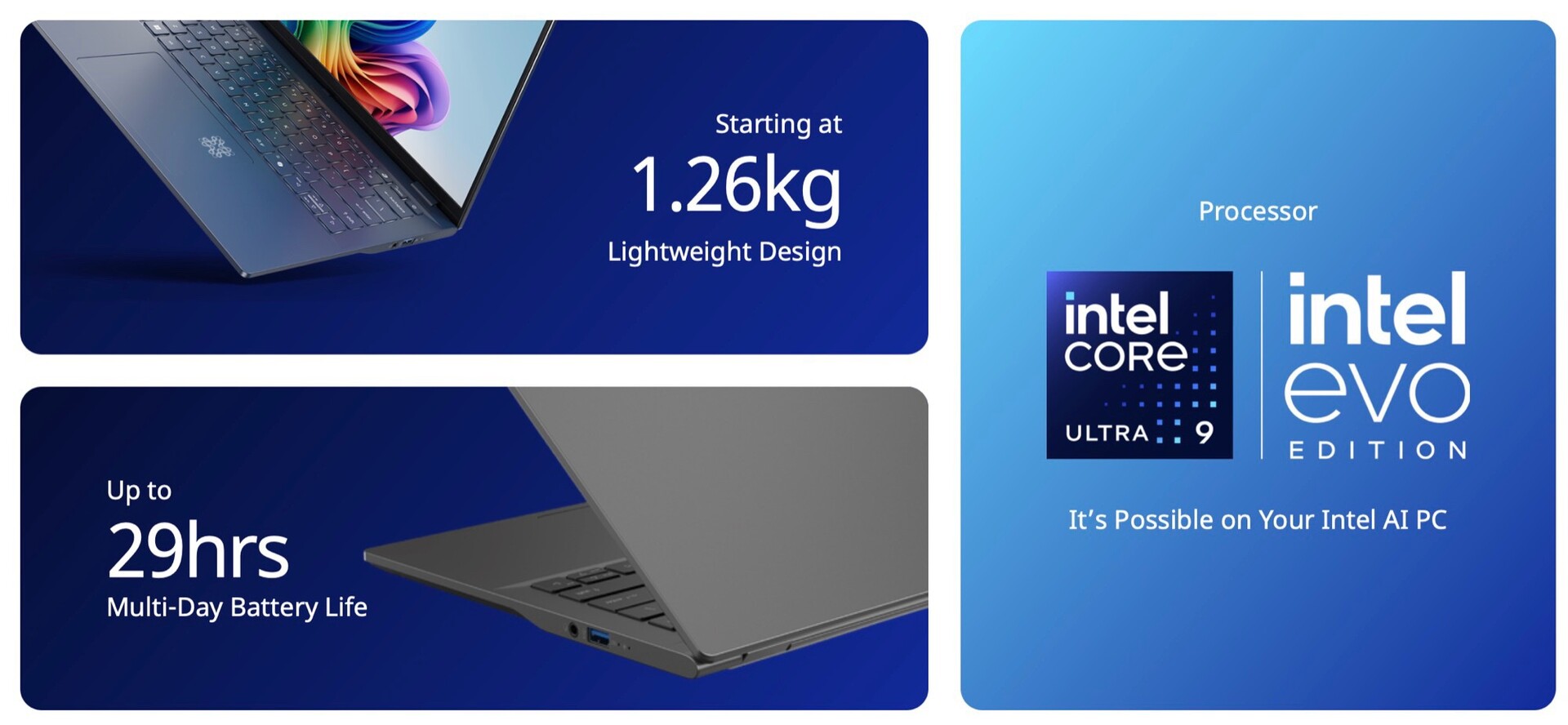 Für 1.449 Euro steht ein Modell mit Intel Core Ultra 7 258V, 32 GB Arbeitsspeicher und 1 TB SSD zur Wahl. Der Akku fällt mit 65 Wh sogar 13 Prozent kleiner aus als beim Snapdragon-Modell, die Laufzeit soll mit 29 Stunden bei der Wiedergabe eines Videos dennoch etwas länger ausfallen. Das 1,26 Kilogramm leichte, 1,59 Zentimeter dünne Ultrabook besitzt eine QHD-Webcam und einen Fingerabdrucksensor für den komfortableren Windows-Login.