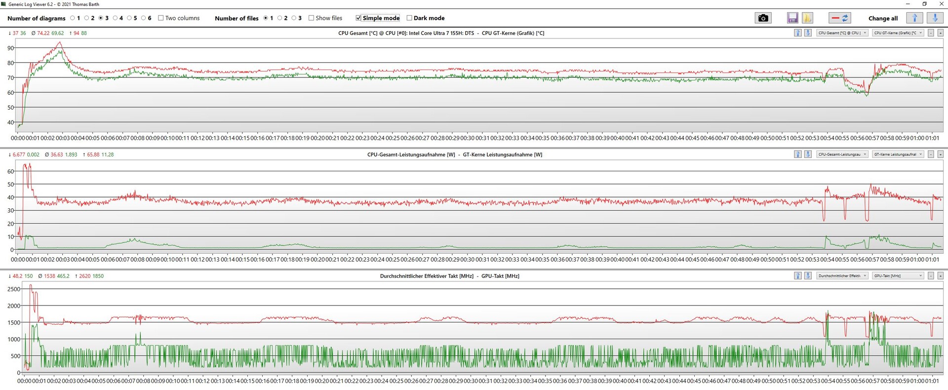 Im Stresstest takten die CPU-Kerne kurz auf 2,6 GHz hoch. Dabei erhitzen sie sich auf bis zu 94 °C, woraufhin sie gedrosselt werden. Der Takt pendelt sich bei etwa 1,5 GHz ein, die Leistungsaufnahme sinkt von 65 W auf rund 37 W.