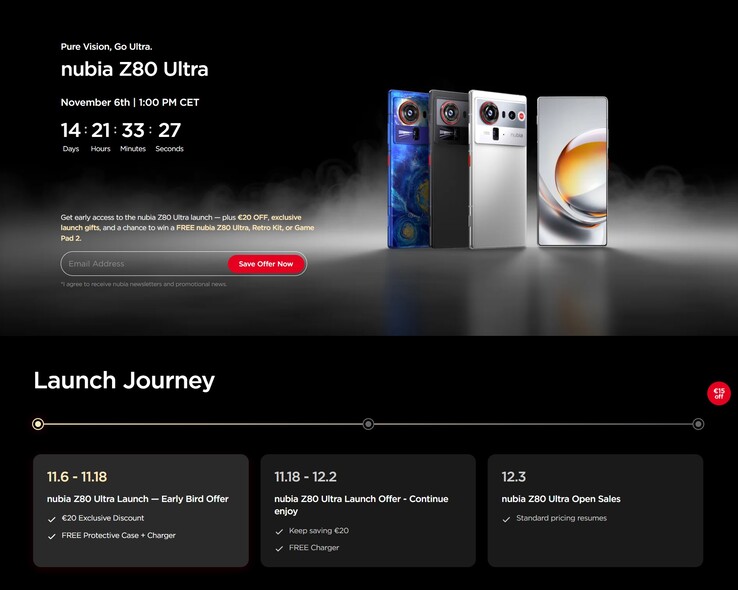 Da ist konkret von einem Launchtermin am 6. November 2025 die Rede, also bereits in zwei Wochen. Wer prinzipiell Interesse an dem neuen Nubia-Flaggschiff hat, kann sich mit seiner email-Adresse registrieren und erhält dann Marketing-Informationen des Herstellers. Im Gegenzug kann man ein Nubia Z80 Ultra, ein Retro Kit oder ein Game Pad 2 gewinnen. Wer sich zwischen dem Launchtermin und dem 18. November für den Kauf entscheidet, bekommt eine Gratis-Schutzhülle und ein Ladegerät sowie einen 20 Euro Vorbesteller-Rabatt.