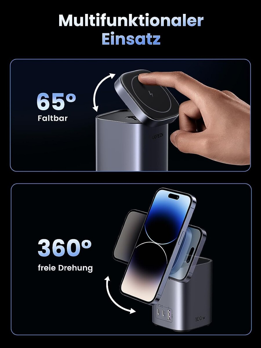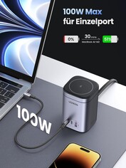 Das neue Ugreen Nexode 100W USB-C Ladegerät mit MagSafe ist eine 4-in-1 Ladestation, die bis zu vier Geräte zeitgleich lädt. Auf der Oberseite wartet eine "Made for MagSafe" zertifizierte Ladefläche, um drahtlos ein iPhone (ab iPhone 12) mit bis zu 15 W zu laden. Der Ladeteller kann hierbei um bis zu 65 Grad hochgeklappt werden, damit das Smartphone beim Laden im Blick bleibt. Zudem kann das Gerät um 360 Grad gedreht und so im Hoch- als auch Querformat geladen werden.
