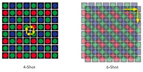 Hasselblad, bekannt durch seine 50 und 100-Megapixel-Kameras im bis zu fünfstelligen Eurobereich, stellt einen weiteren Meilenstein, die Mittelformatkamera H6D-400c MS mit 400 Megapixel, obwohl der Sensor nur 100 Megapixel erfasst, vor. Der Trick dahinter ist, dass dieser Sensor beweglich ist und für 400-MP-Aufnahmen sechs Bilder pro Aufnahme schießt. Hasselblad nennt dies den Multi-Shot-Modus. Bei den ersten vier Aufnahmen wird der Sensor jeweils um einen Pixel im Kreis verschoben bewegt, um echte Farbdaten zu erhalten. Danach werden noch zwei weitere Belichtungen durchgeführt, diesmal wird der Sensor um einen halben Pixel horizontal und dann vertikal bewegt. Diese sechs Aufnahmen ergeben am Ende zusammengeführt ein Gesamtfoto mit 400 Megapixel und einer Auflösung von 23.200 x 17.400 Pixeln.