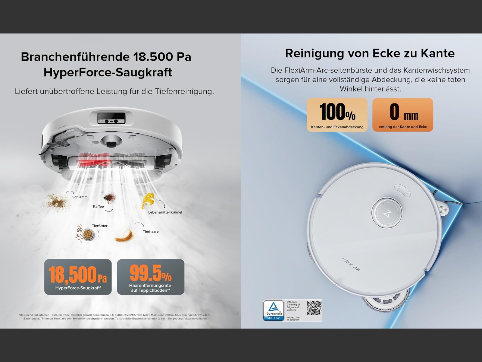 Im Test von Vacuum Wars hat der Qrevo Edge sehr gut abgeschnitten: 4,7 von 5 Sternen. Besonders hervorgehoben wurde die extrem starke Saugleistung von 18.500 Pa, die in Verbindung mit der DuoDivide-Bürste und der FlexiArm-Seitenbürste für eine sehr gute Schmutzaufnahme auf Teppich- und Hartböden sorgen soll – inklusive Bodenkante. Haare verfangen sich dank der neuen Bürstenkonstruktion praktisch gar nicht, so die Testergebnisse. Das ist ein erheblicher Pluspunkt im Hinblick auf den Wartungsaufwand. Die Wischfunktion arbeitet mit zwei rotierenden Mopp-Pads, die im Test gute Reinigungsergebnisse erzielt haben und sich automatisch ausfahren können, um Kanten besser zu reinigen.