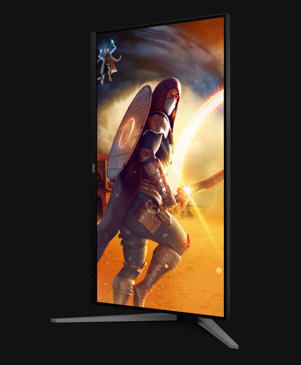 Das Fast-IPS-Panel erreicht eine Reaktionszeit von 0,5 Millisekunden, Adaptive Sync soll Bildrisse verhindern. AOC macht keine Angaben zur Farbdarstellung, die Helligkeit fällt für diese Monitorklasse aber relativ hoch aus, denn der Bildschirm erreicht vollflächig immerhin 450 Nits. Mangels lokalem Dimming dürfte der Bildschirm keine überzeugende HDR-Darstellung liefern. Die Oberfläche ist entspiegelt.
