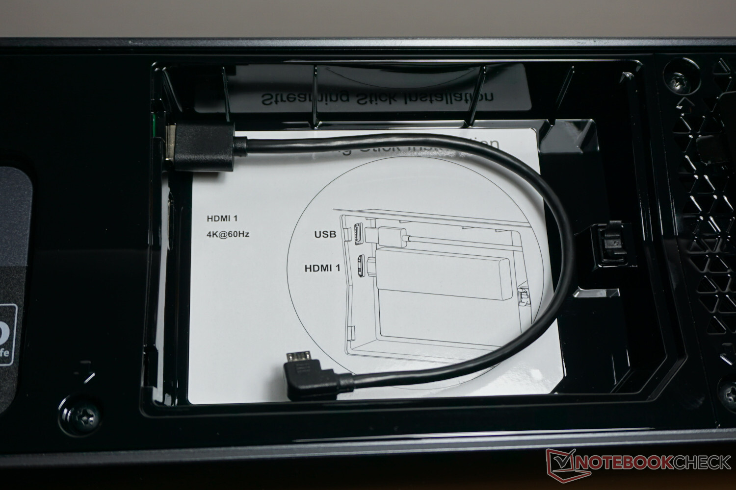 Wobei in einer perfekt abgemessenen Aussparung der Polsterung noch ein Fire-TV-Stick für 4K von Amazon im Original-Karton beiliegt. Genau dieser Stick lässt sich im vorgesehenen Fach auf der Rückseite des Projektors perfekt einsetzen. Auch das zugehörige Stromkabel von USB-A auf Micro-USB ist bereits gesteckt.