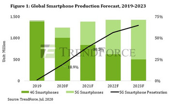 Im Zuge der von TrendForce bereits für das laufende Jahr 2020 prognostizierten Gesamtproduktion von 1,24 Milliarden Smartphones rechnen die Marktforscher damit, dass die Produktion von 5G-Handys voraussichtlich 235 Millionen Einheiten erreichen wird, was einem Marktanteil von 18,9 % entsprechen würde. TrendForce erwartet, dass chinesische Marken vier der sechs ersten Plätze unter den 5G-Smartphone-Marken belegen werden, die nach Produktionsvolumen gelistet werden.