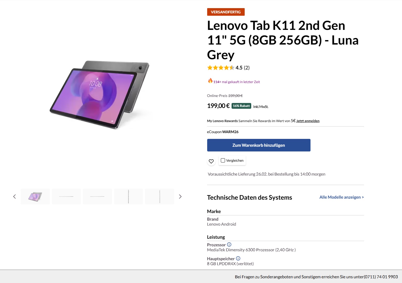 Lenovo hält mit der Tab-K11-Gen-2-Reihe eine Serie recht preisgünstiger Android-Tablets parat, die mit einem guten Ausstattungsniveau aufwarten können. Aktuell führt der Lenovo Store mit dem Tab K11 Gen 2 (ZAFN0017SE) einen Vertreter der Reihe zu einem Angebotspreis von 199 Euro im Sortiment. Das K11 lag uns noch nicht für einen Test vor, das baugleiche Schwestermodell Idea Tab hingegen schon.