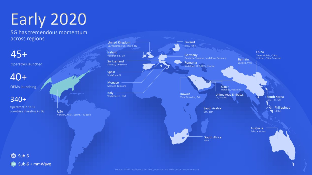 45 Provider sind aktuell schon mit 5G-Netzen online, die meisten davon im Sub-6-Bereich (unter 6 Ghz), einige wenige, wie etwa in den USA aber auch bereits im sogenannten High-Band zwischen 24 und 40 Ghz, dem Millimeter-Wellen-Bereich meistens mmWave genannt. Letzterer erlaubt die so oft beworbenen hohen Geschwindigkeiten, ist aber in der Ausbreitung stark lokal begrenzt. Das Mid-Band unter 6 Ghz ist von der Up- und Downloadgeschwindigkeit nur wenig schneller als gutes LTE, deckt aber große Bereiche ab, was es etwa T-Mobile in den USA erlaubt, mit fast flächendeckender Versorgung zu werben.
