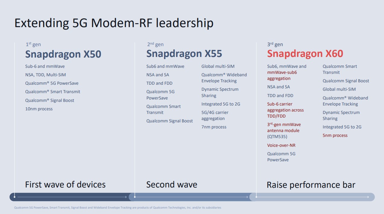 Als letzte Qualcomm-Neuerung des Tages sei noch die ultraSAW-Filter-Technologie erwähnt, eine maßgeblich vom deutschen Qualcomm-Team in München mitentwickelte Verbesserung gegenüber bestehenden BAW-Filtern. Diese isolieren die RF-Signale aus den unterschiedlichen Frequenzbändern und ermöglichen dem Endgerät deren Verarbeitung. Hier hat Qualcomm eigenen Angaben zufolge dramatische Verbesserungen beim Qualitätsniveau und der Effizienz erreicht, auch über weite Temperaturbereiche hinweg. Unten noch ein Überblick über die Verbesserungen im Vergleich zu Qualcomms bekannten X50 und X55-Modems.
