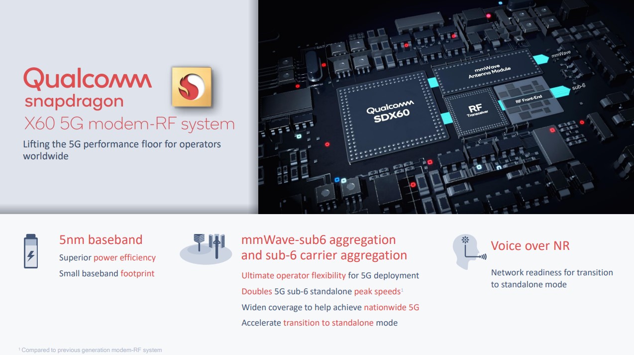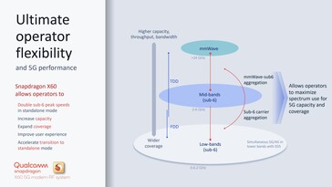 In gewisser Weise ähnelt der 5G-Ausbau dem Wechsel von 3G auf 4G vor einigen Jahren. Wie damals, wird aktuell in 5G-Netzen dank EPS-Fallback (Evolved Packet System) die Sprachübertragung übers LTE-Netz geschickt, analog zu VoLTE ist aber auch hier eine einheitliche Lösung im Aufbau, die sich bei 5G Voice over NR nennt (Voice over New Radio). Das neue Qualcomm-Modem unterstützt Voice over NR bereits und ermöglicht es Netzbetreibern daher schrittweise von einer Non-Standalone (NSA) zu einer Standalone-Lösung (SA) zu wechseln. Zum Thema Aggregation sei übrigens noch erwähnt, dass im X60-Modem nicht nur Datenströme zwischen Sub-6-Bändern und mmWave aggegriert werden können sondern auch zwischen dem FDD und dem TDD-Spektrum, womit sich die einzelnen Datenströme in der Summe jeweils addieren.