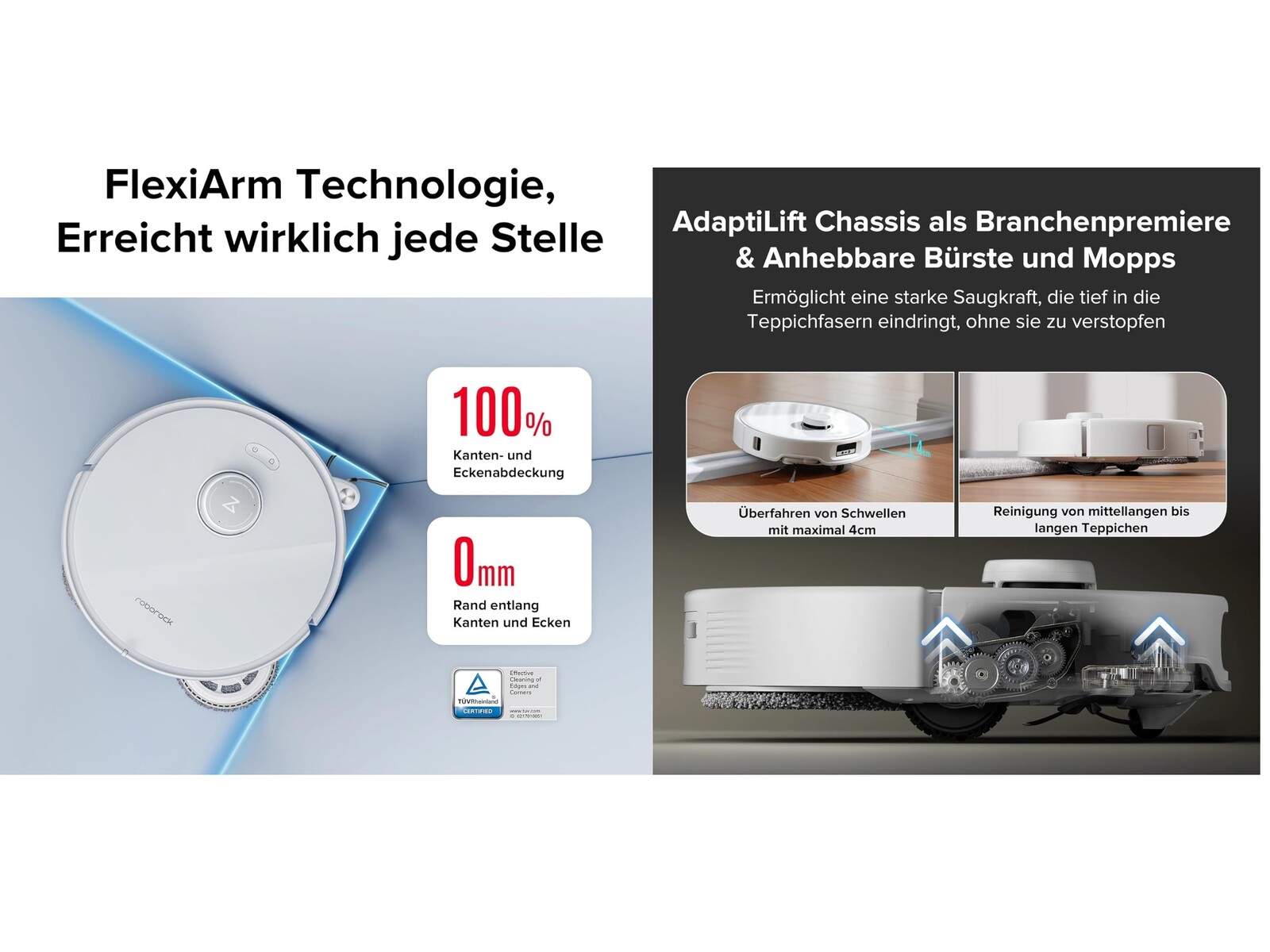 Neben einer hohen Reinigungsleistung bietet der Qrevo Curv ein umfassendes Komfort-Paket, sodass die Station einen Großteil der Wartung übernimmt: sie wäscht und trocknet die Mopps, füllt Wasser nach und entleert automatisch den Staubbehälter. Zudem hebt der Roboter sein Gehäuse an soll damit damit selbst höhere Teppichkanten oder Türschwellen bis etwa 4 cm überwinden. Die App bietet Kartierung, Raumplanung, No-Go-Zonen und individuelle Saug- und Wischprofile.
